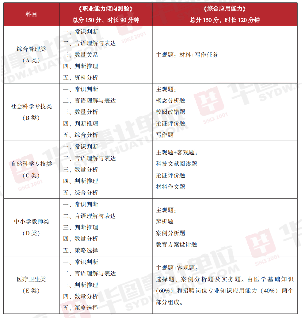 事業(yè)單位聯(lián)考 ABCDE 類(lèi)五個(gè)考試類(lèi)別的公共科目均為 《職業(yè)能力傾向測(cè)驗(yàn)》和 《綜合應(yīng)用能力》。